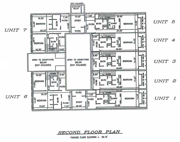 The two units on the building's west side cover 1,360 square feet each and have two bedrooms and two and a half bathrooms. The five units on the building's east side each have a one bedroom and one and a half bathroom floor plan available in either 840 or 910 square feet. The five units overlook Seaside's pivotal Central Square, the amphitheater and the Gulf. Each unit includes a private patio complete with a hot tub. A controlled elevator services the residential units, and a patio and terrace are in place for residents exclusively to enjoy. The building's frontage was designed according to the mandates of the Seaside Design Code, which aims to preserve the integrity and characteristics of Seaside's essence that requires buildings to blend with and enhance the town as a whole.