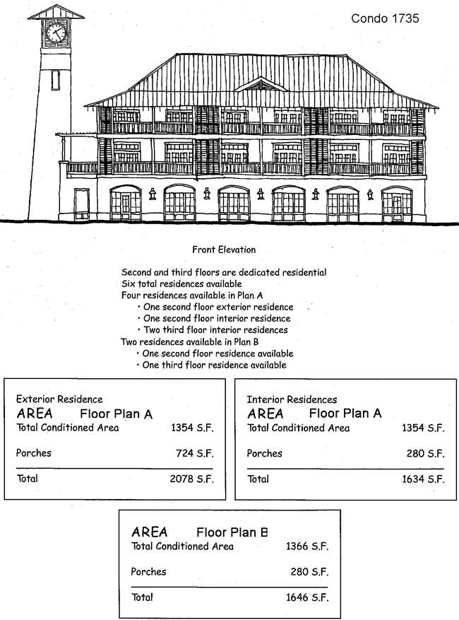 Built in 2000, WaterColor Condominium 1735 has one floor of commercial space at its base and two residential floors above. The mixed-use building affords beautiful views of the nearby Gulf of Mexico and contains a total of six residential units in two slightly different floor plans called Plan A and Plan B. All six units occupy one level and feature