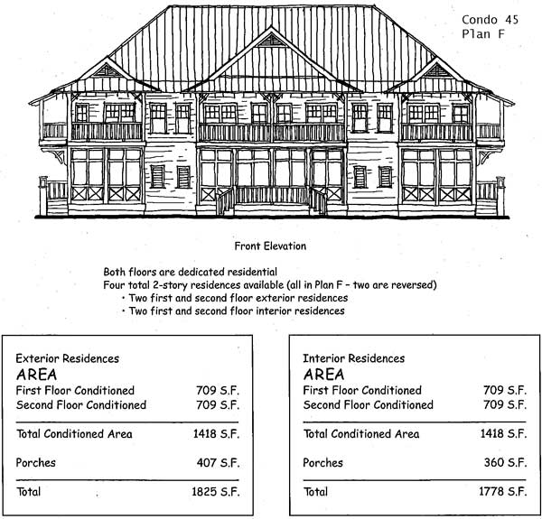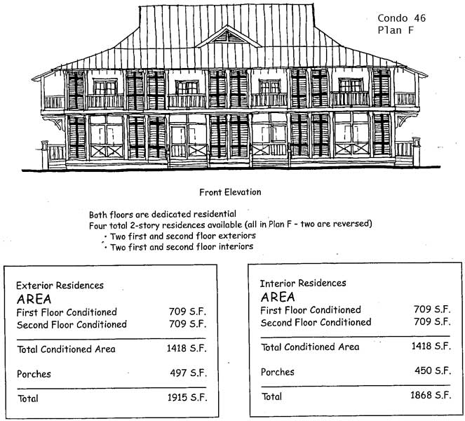 all units is plan F, which spans 1,418 square feet and includes two bedrooms and 2.5 bathrooms. Both bedrooms are on the bottom floor; the living area and kitchen are on the top floor. Plan F units also feature a large porch off the master bedroom and another off the living area. Although the floor plans are otherwise identical, units in condominium number 46 offer 90 additional square feet of porch space.