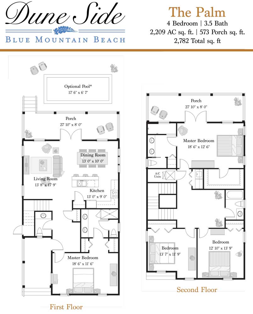 Buyers can select three-story houses or residences that have two floors, and each homesite provides space for an outdoor pool and a sizable porch. Some houses also contain a relatively spacious office. Every residence features three to four bedrooms and at least three bathrooms, and each house has a total area ranging from 1,690 square feet to 2,843 square feet.